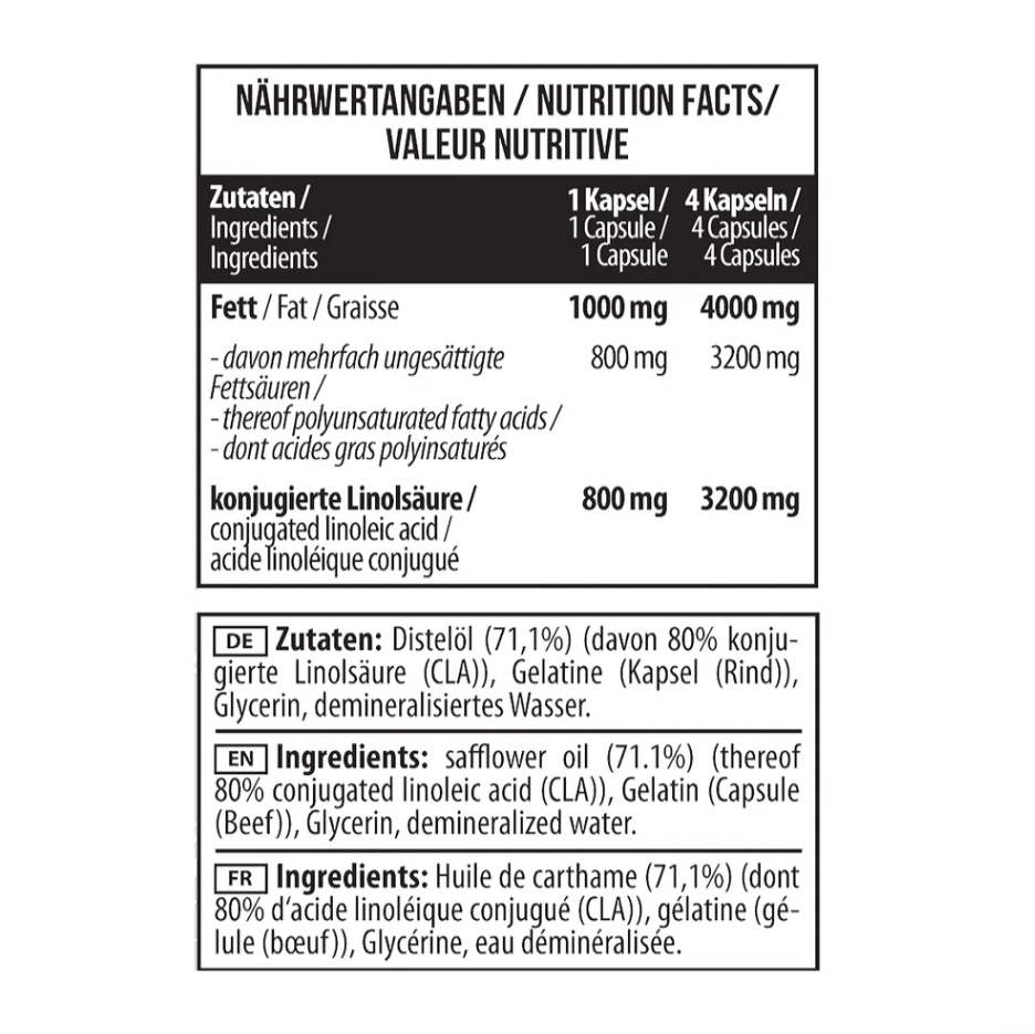 Distelöl (71,1%) (davon 80% konjugierte Linolsaure (CLA)), Gelatine (Kapsel (Rind)), Glycerin, demineralisiertes Wasser.